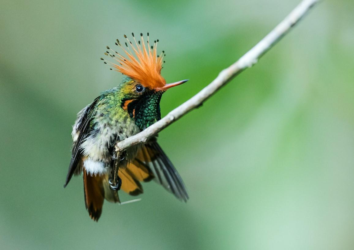 Este pequeño bello colibrí conocido vulgarmente como coqueta crestirrufa (Lophornis delattrei) se distribuye en Sudamérica y presenta dimorfismo sexual. El macho es muy llamativo tanto por su color verde iridiscente como por su característica cresta color naranja donde cada una de las puntas de las plumas son de color negro. La hembra a pesar de no presentar cresta tiene la corona, la garganta y los costados de su cuerpo de color canela.