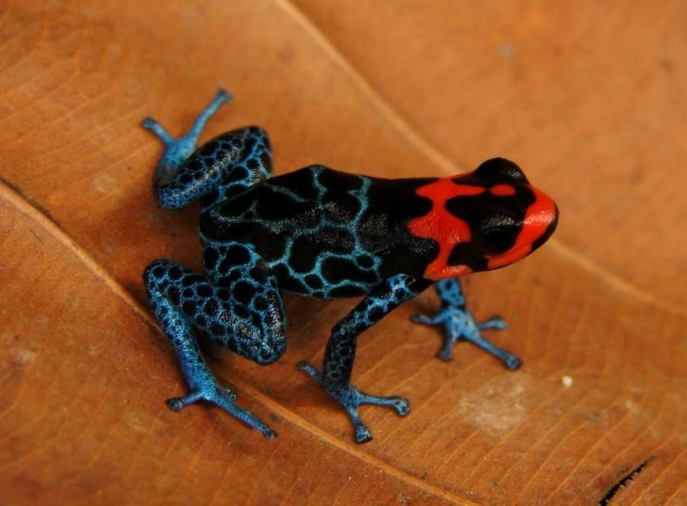 Esta especie de rana punta de flecha o dardo (Ranitomeya amazonica) es tan bonita como peligrosa, ya que es una de las ranas más venenosas que existe. Habitante de selvas tropicales, mide entre 16 y 19 milímetros y presenta una coloración muy extravagante ya que su dorso es negro y posee líneas gruesas rojas brillantes y su garganta es anaranjada. Sus miembros anteriores y posteriores son de color azul y negro.