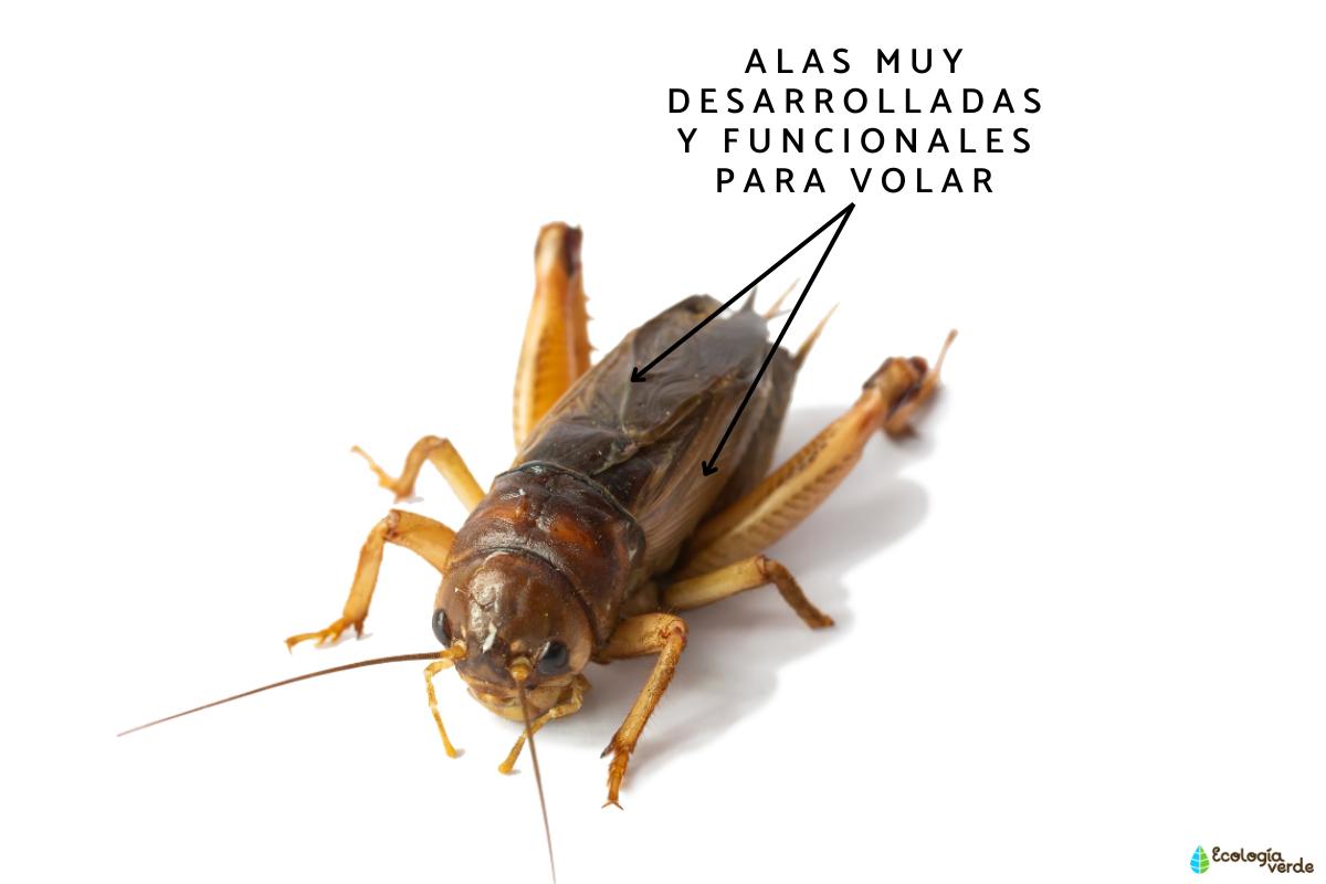 Las alas de los grillos adultos se extienden hacia abajo y a los lados. Aunque los grillos de campo tienen alas completamente formadas, no todos ellos son voladores activos. Sin embargo, especies como los grillos domésticos y de campo pueden utilizar sus alas para volar cortas distancias, especialmente hacia luces durante la noche. Este comportamiento es más común en condiciones oscuras, cuando buscan atraer parejas o escapar de depredadores.