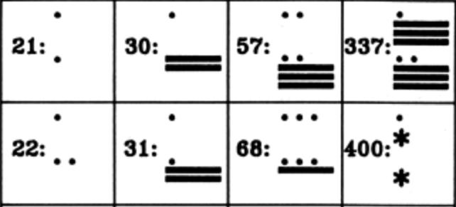 Conforme ascienden las cifras, la simbología se torna un poco más compleja. El número 30 está representado por dos líneas que suman 10, mas el veinte en segunda posición. Con el número 57 los puntos y líneas debajo suman 17, mas los 40 puntos superiores, dan el resultado correcto.