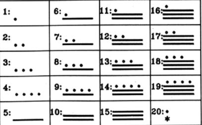 Para los mayas, solo hubo tres signos que representaron cualquier número: el punto, la raya y el caracol, aunque algunas veces este caracol podía estar representado por otra forma. El punto valía 1; la raya 5 y el caracol, cero.