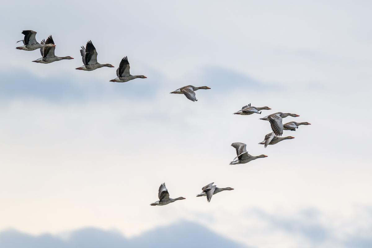 Las aves vuelan en formación de V para aprovechar la corriente de aire generada por los individuos que van al frente. Al batir sus alas, las aves líderes empujan el aire hacia abajo y hacia atrás, reduciendo su resistencia. Si los patos que van detrás posicionan el extremo de sus alas en estas corrientes ascendentes, logran ahorrar energía y optimizar sus viajes de larga distancia.