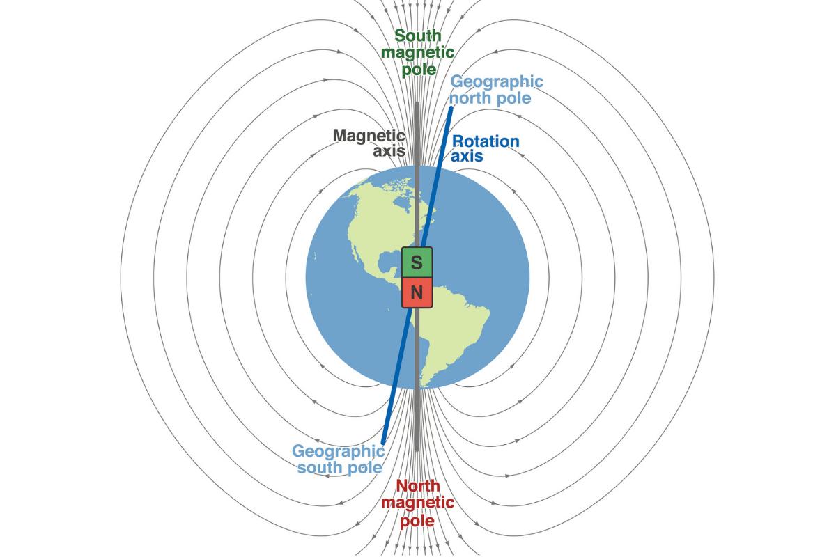 - Campo magnético terrestre: también llamado campo geomagnético, originado por la combinación de dos efectos, la rotación planetaria y el hierro fundido en el núcleo de la Tierra junto a los materiales cargados eléctricamente en él.