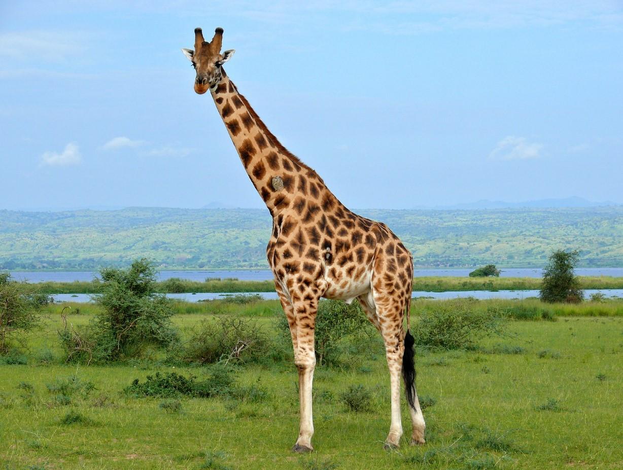 El tamaño de las grandes jirafas es de unos 3,5 m de altura y su peso de unos 800 kg. Conocida por su largo cuello, la jirafa también tiene también orejas y ojos grandes y patas largas. Son de hábitos crepusculares y nocturnos y herbívoras ramoneadoras, su comida preferida son las hojas de acacias y pasan cerca de 20 horas al día alimentándose.