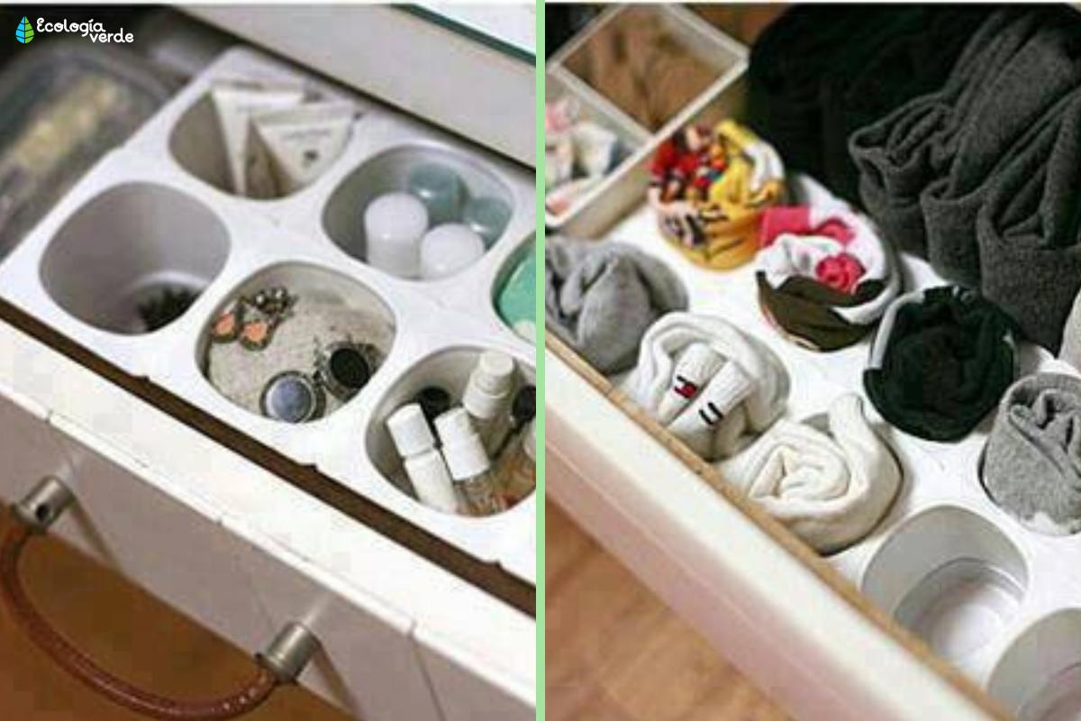 Reciclar vasitos de yogur es fácil si los convertimos en organizadores de cajones. En este sentido, los vasitos de yogur no tienen precio. Bastará con colocarlos uno junto al otro, sin más, a ser posible dentro de una cajita o estructura que los mantenga unidos, o encajémoslos a presión. El resultado será perfecto para guardar desde bisutería, calcetines e incluso monedas.