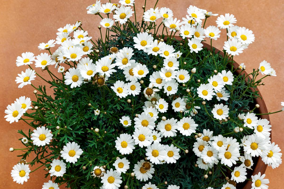 Los cuidados de las margaritas son temperatura templada y sustrato drenante. Son plantas de sol y el riego debe ser alto. No necesitan poda, ya que son de altura baja, aunque puede podarse similar al pasto.