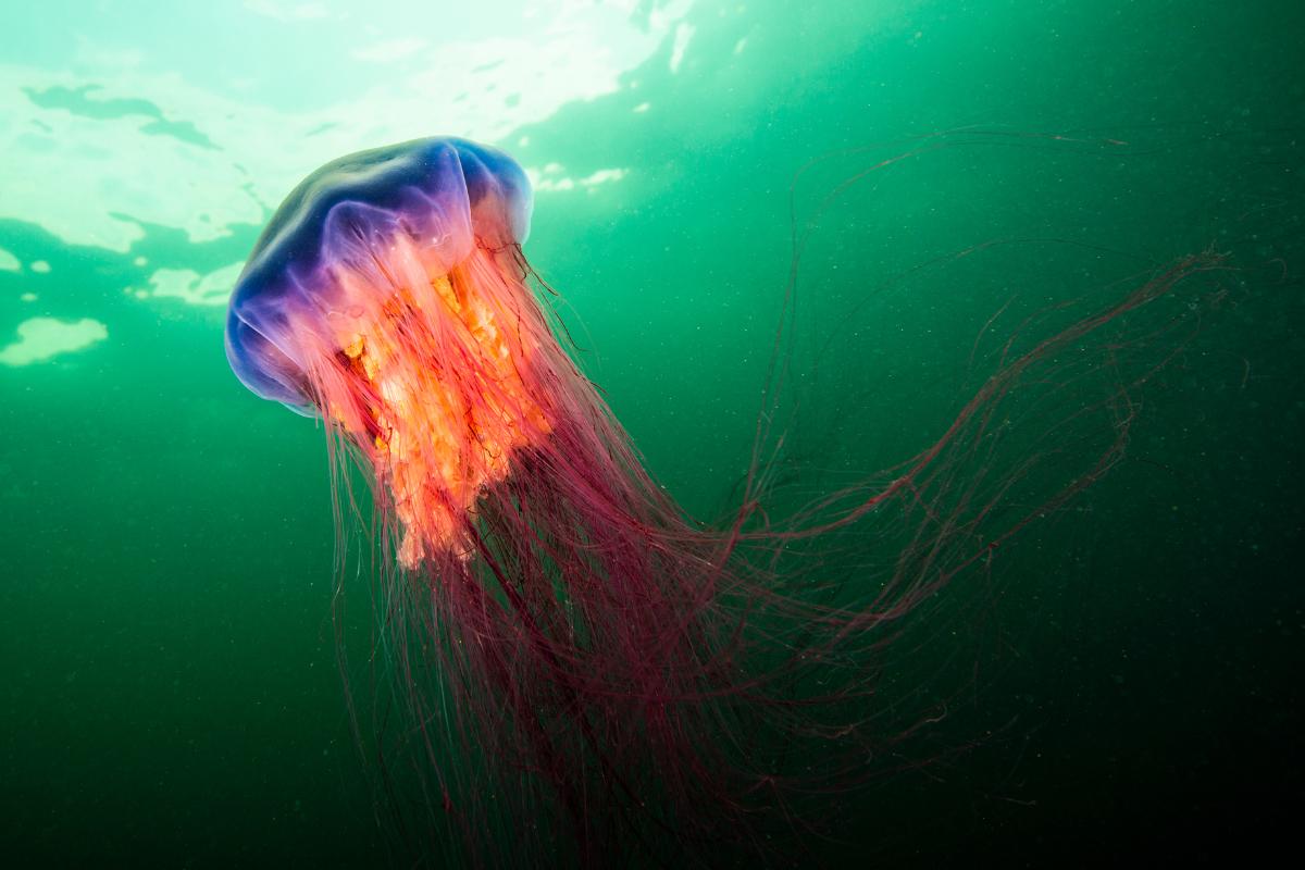 La medusa melena de león gigante es un animal invertebrado que vive en las profundidades del mar. Se le llama así por las largas hebras que salen de su cuerpo y que nos recuerdan la cabellera del león. Son de fascinantes colores como el carmesí, bermellón, amarillo y naranja, todo en un mismo ejemplar.
