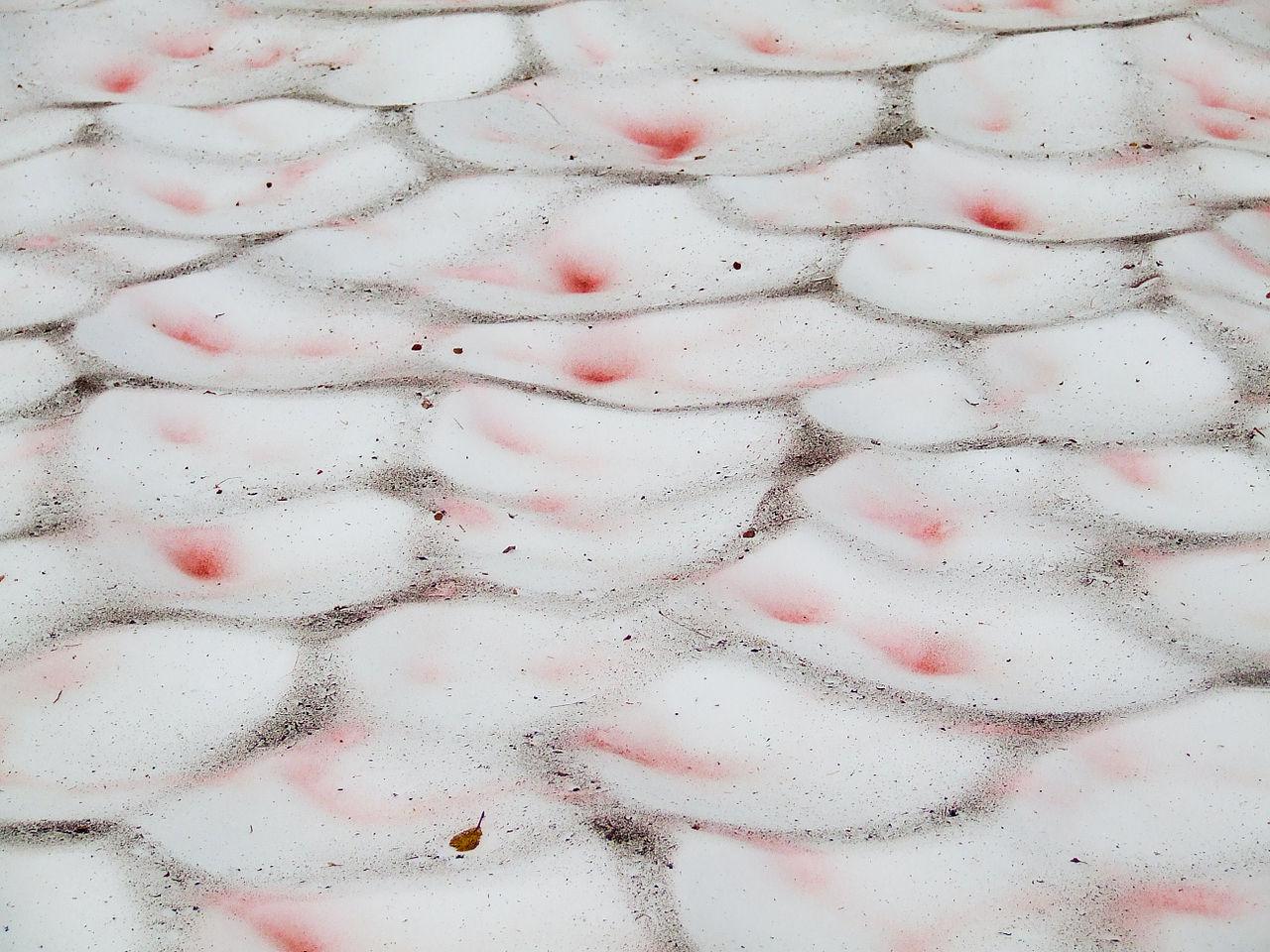 La nieve rosa sucede cuando la nieve blanca se tiñe de dicho color, normalmente en parches rosas o como un manto sobre la nieve blanca. Al comprimir la nieve se vuelve todavía más notorio. Es provocada por las algas de nieve de nombre científico Chlamydomonas nivalis, que son unicelulares y microscópicas.