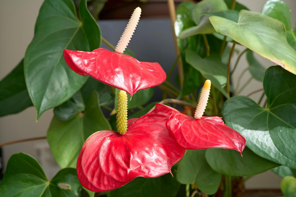 Si estás buscando plantas con flores de interior, esta es tu opción. El anturio es una planta tropical que da gruesas hojas con una flor compuesta por una espata, que es una hoja modificada, de colores llamativos en rojo, blanco o rosa, y al centro lleva un bastón amarillo que es la inflorescencia.