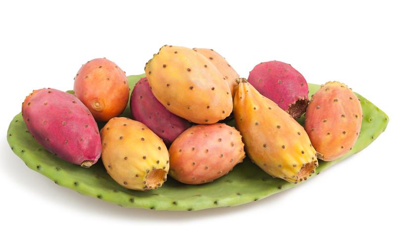Después de la floración, se desarrollan frutos en forma de pera invertida, de colores que van desde el verde claro hasta el rojizo e incluso púrpura. Su piel es ligeramente dura y está cubierta de gloquidios. La carne del interior es dulce, jugosa, gelatinosa y de un color semejante al de la piel, con varias semillas pequeñas.