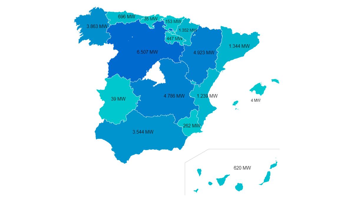 Según un informe de la Asociación Empresarial Eólica (AEE) que trata acerca del impacto macroeconómico del sector, cinco comunidades autónomas: Castilla y León, Aragón, Galicia, Andalucía y Castilla-La Mancha, concentran más del 70% de la potencia eólica del país. El 50% de los 1.600 MW nuevos que se encuentran operativos, se ubicaron en plantas en Castilla-La Mancha (837 MW) y aproximadamente un 30% en Aragón (492 MW). Asimismo, se instalaron nuevas potencias en Castilla y León, Cataluña, Canarias, Navarra, Asturias y Andalucía. A continuación, puedes ver este mapa de los parques eólicos en España, con la potencia de cada comunidad autónoma.