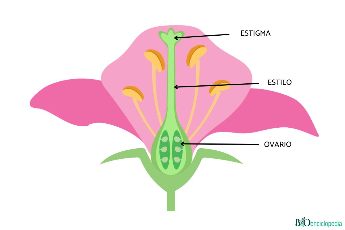 - Estilo: es un conducto que conecta con el ovario. Aquí se forma el tubo polínico por parte del polen, que sirve para transportar los gametos masculinos hasta el óvulo. Algunas flores no tienen estilo y el estigma está directamente en el ovario.