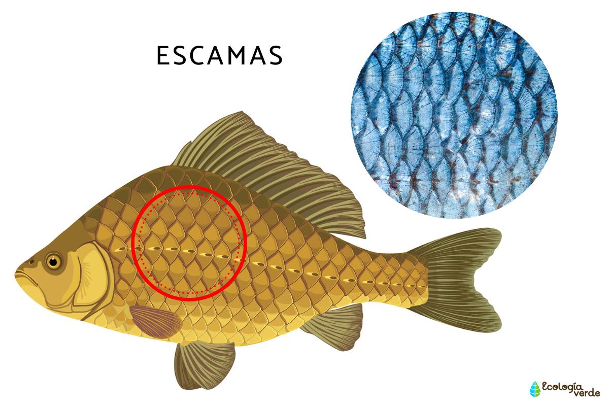 Como protección adicional en la mayoría de los peces encontramos escamas sobre el tegumento. Las escamas son estructuras de origen dérmico, a diferencia de las escamas de los reptiles que son repliegues de la superficie epidérmica.