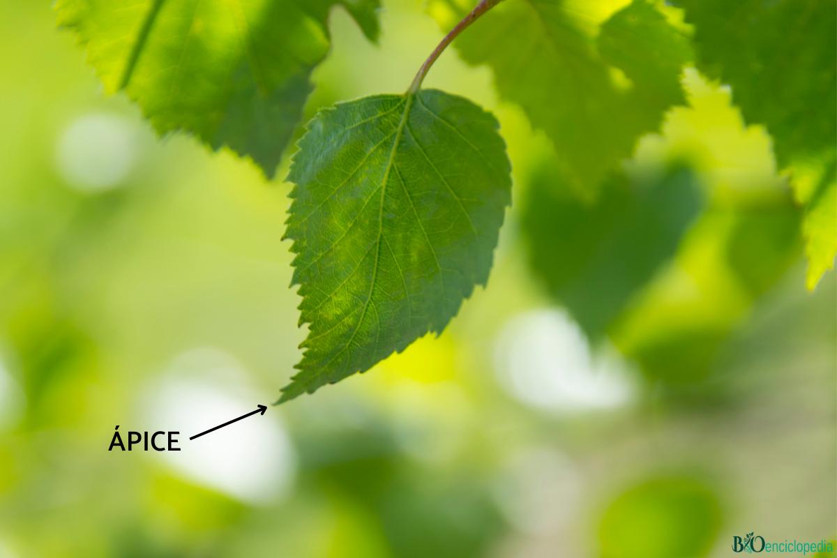 Es el extremo superior o punta de la hoja. Se puede hablar de un ápice geométrico que es cuando solo se refiere a la punta de la hoja, y del ápice orgánico, que es en donde puede crecer distalmente el órgano, abastecido de tejido meristemático.