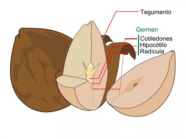 - El endospermo, que es la capa formada por las sustancias y nutrientes de reserva que el embrión necesita para crecer.