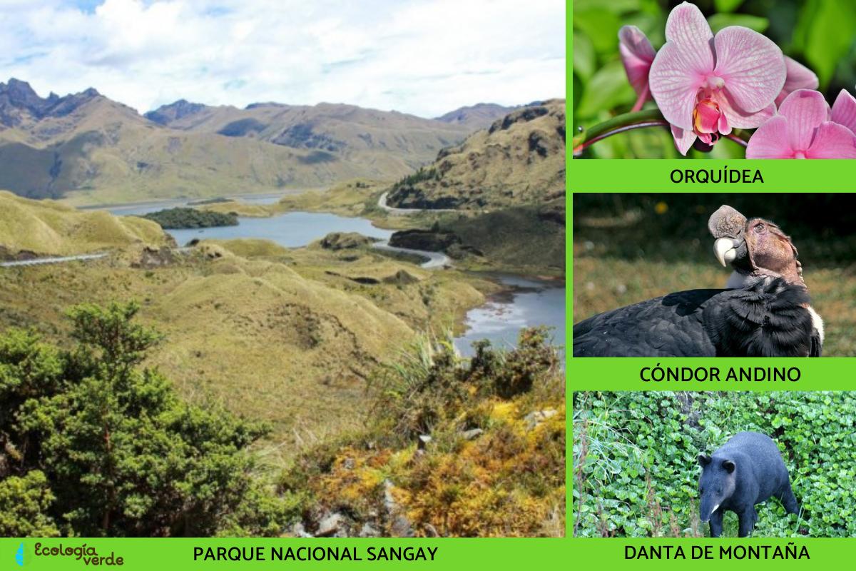 En cuanto a las especies que alberga el parque, presenta más de 3.000 especies vegetales, de las cuales alrededor de 500 especies son endémicas, dentro de estas últimas se destacan las orquídeas. Por su parte, el Parque Nacional Sangay es el hábitat de aproximadamente 500 especies de animales vertebrados, siendo las aves el grupo más abundante. El cóndor andino (Vultur gryphus) y la danta de montaña (Tapirus pinchaque) son las especies animales más emblemáticas.