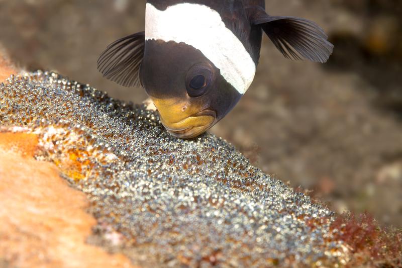 Desde entonces, el pez payaso macho se convierte en el protector de los huevos durante un período de entre 6 y 10 días. Los huevos eclosionan unas dos horas después la puesta del sol.