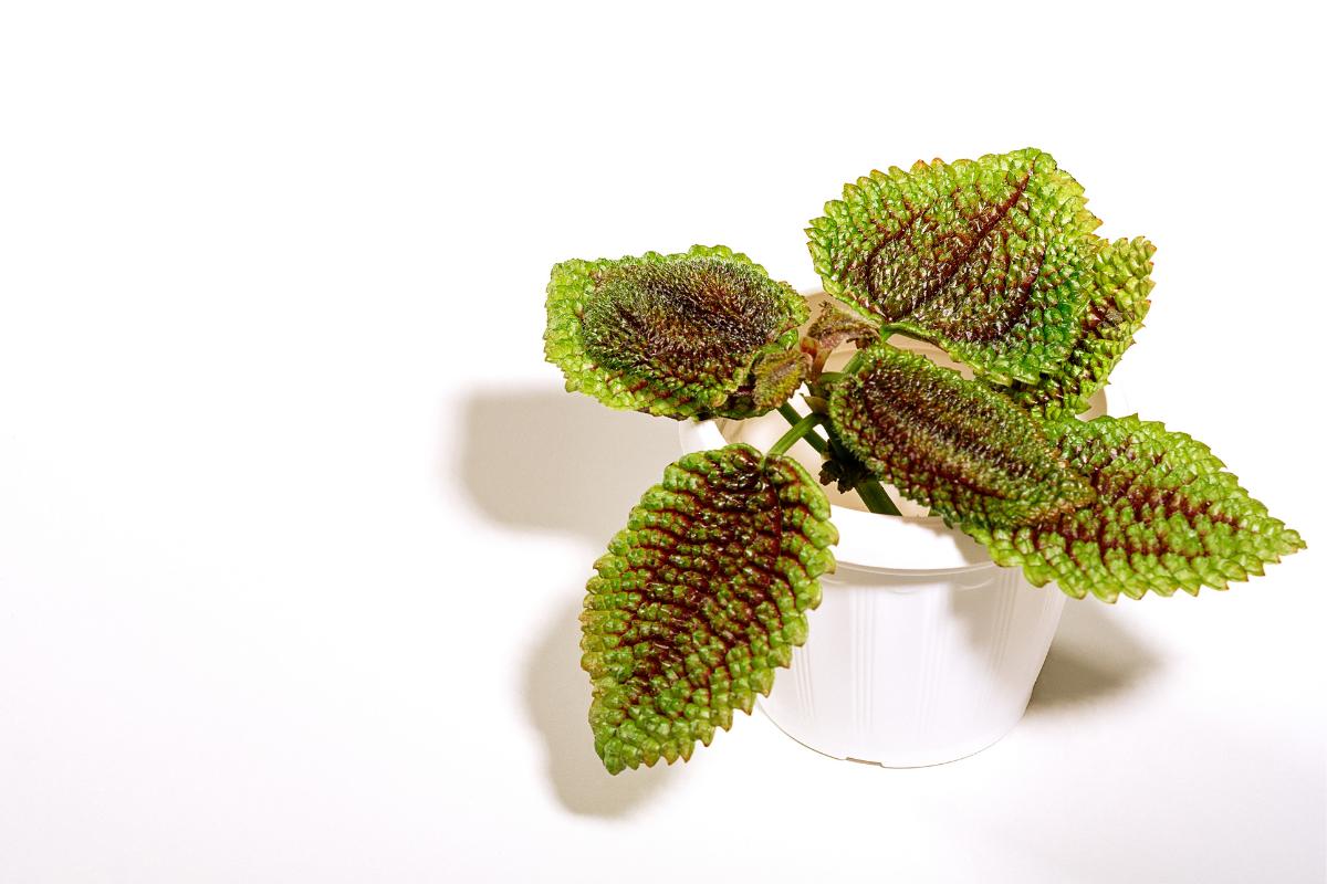 - Sus hojas son algo redondeadas, de un tono verde llamativo y brillante, que miden entre dos y tres centímetros de largo. Es una hoja muy texturizada que suele tener venas plateadas y sombras color vino, lo que la hace un ejemplar muy estético a la vista.