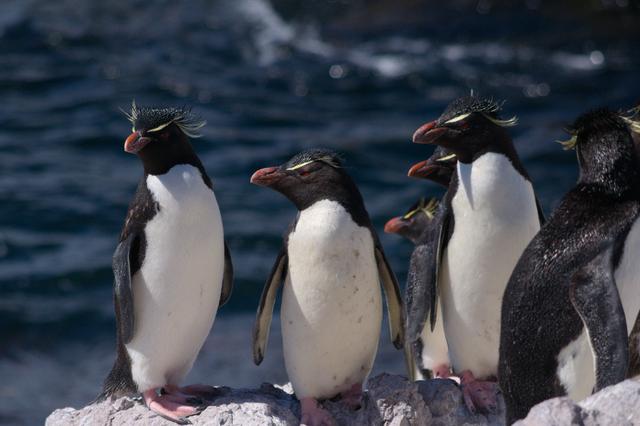Finalizando con el género Eudyptes, mencionaremos al pingüino de penacho amarillo o saltarrocas del sur (Eudyptes chrysocome), que es el más pequeño dentro de los pingüinos crestados. Como su nombre bien lo indica, presenta una cresta amarilla que se extiende por atrás de sus ojos. Se encuentra clasificado como vulnerable a la extinción y las causas de su vulnerabilidad se asemejan a las descritas anteriormente. En cuanto a su distribución, difiere según la subespecie: