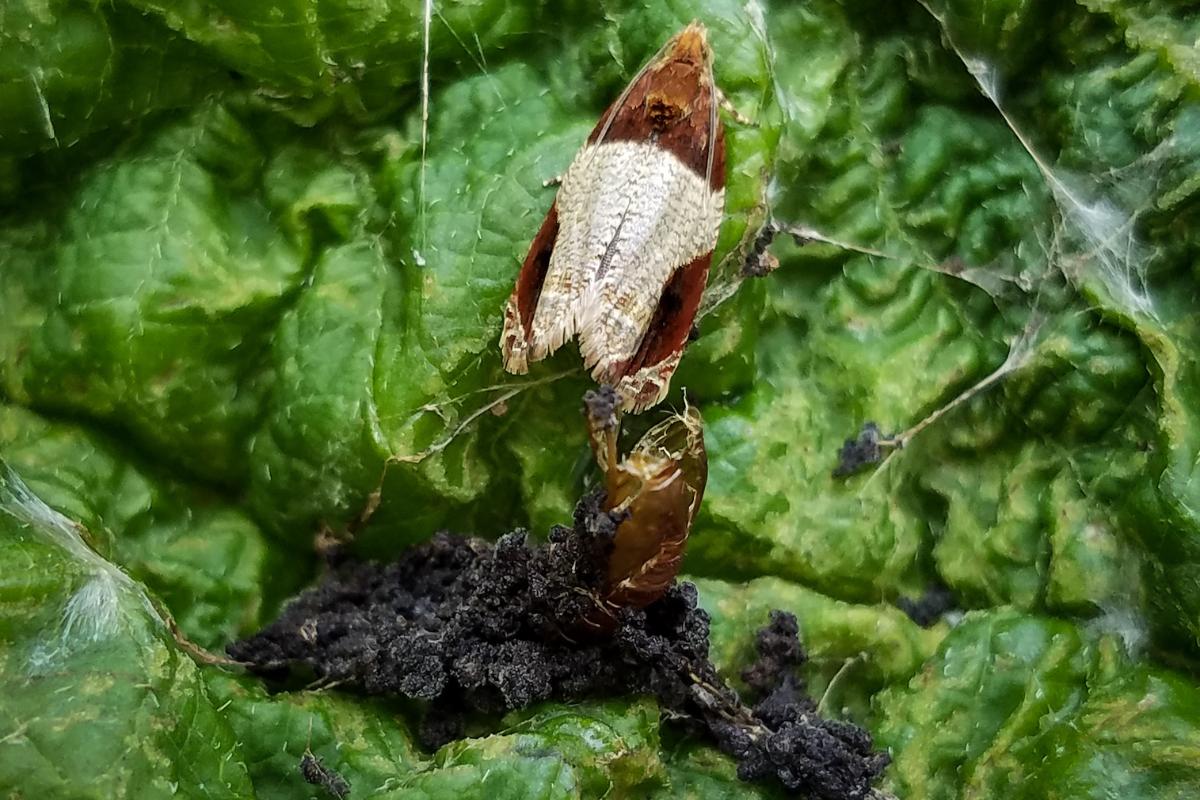 Esta es una polilla que usa las hojas de hortensia para pasar su tiempo de reposo de pupa. La especie es Olethreutes ferriferana, y daña a la planta porque usa sus hilos de seda para encerrarse dentro de su crisálida, arropada por la hoja de hortensia.