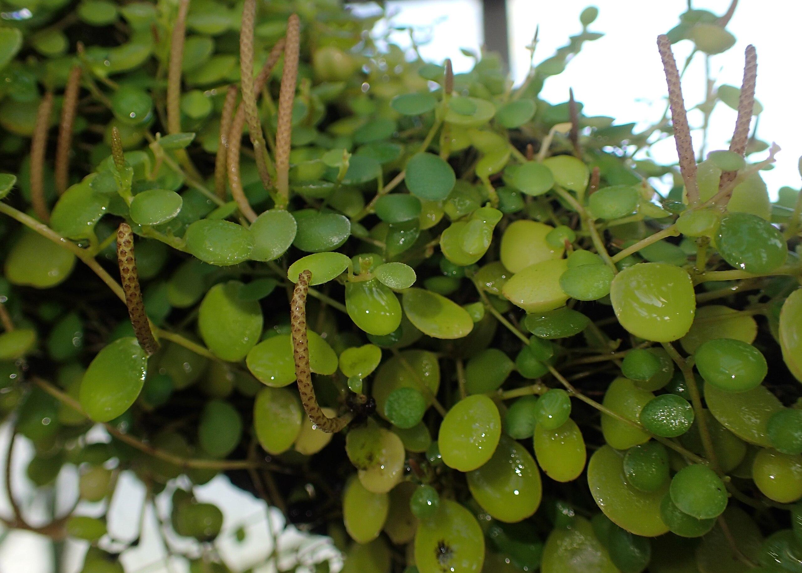 Es una especie de peperomia colgante. Las hojas retienen agua, así que su riego puede ser bajo. Son pequeñas y de color verde oscuro, de forma casi circular. Se da bien en condiciones de luz baja. Su crecimiento compacto y elegante la convierte en una planta ideal para decorar estanterías o espacios pequeños.