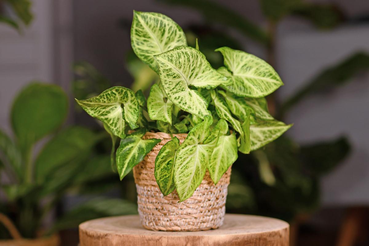 El singonio es una planta de hojas en forma de punta de flecha, con hojas de unos 10 centímetros en colores verde claro a blanco. Es una planta de interior que no requiere mucha luz, cuyos tallos crecen hacia abajo conforme crecen, de forma colgante. Son tolerantes a diferentes condiciones de luz, así que puedes tenerla con baja luz. Eso sí, considera que si los tallos comienzan a alargarse y producen muy pocas hojas, quiere decir que requiere más sol.