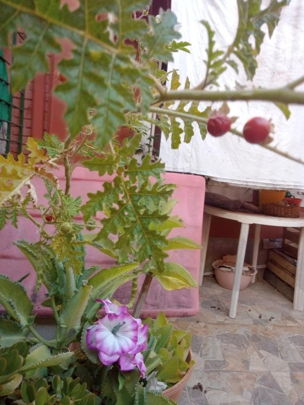 Hay una planta silvestre con espinas, flores lila claro, frutos redonditos rojos