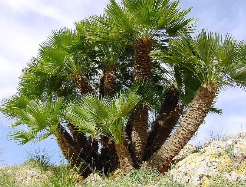Su nombre científico es Chamaerops humilis y se trata de la única palmera silvestre que existe con origen en Europa. Es una planta muy tupida, de porte bajo y con un sistema radicular de gran desarrollo. Es bastante resistente y su altura no supera habitualmente los 3 o 4 metros. Su debilidad son las heladas, que no tolera. Es una de las plantas de exterior que necesitan poca agua más fáciles de cuidar.