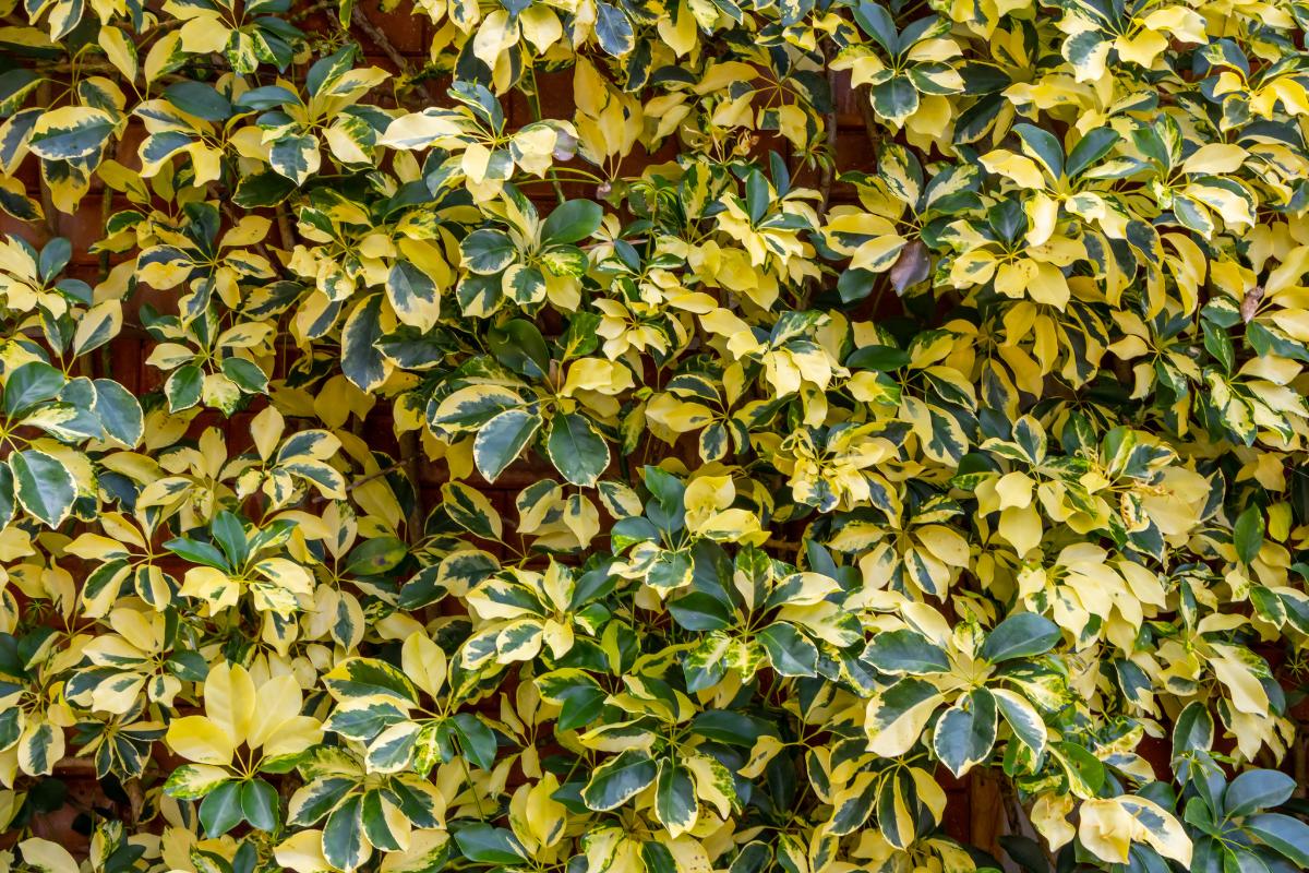 Es conocida científicamente como Schefflera, destaca en interiores por su crecimiento rápido y sus hojas largas y brillantes que se despliegan como los radios de un paraguas. Sus hojas son de dos tonos mezclados: verde y amarillo intensos.
