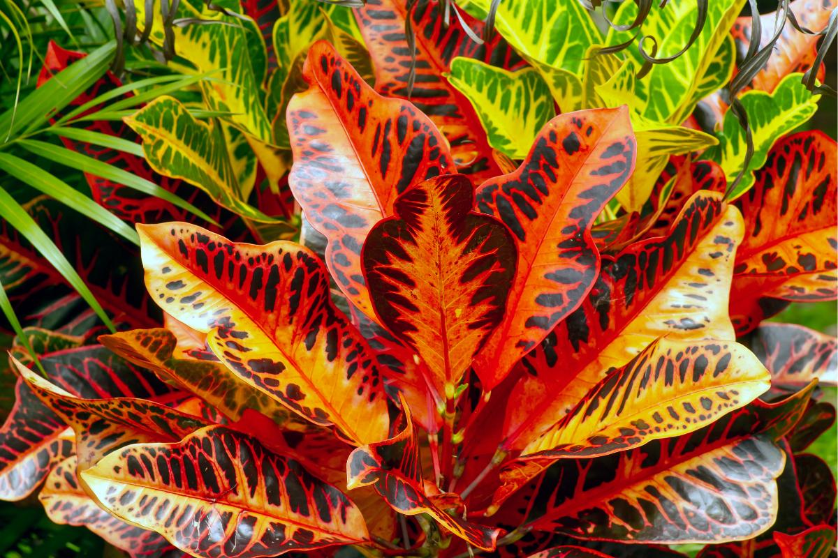Su nombre científico es Codiaeum variegatum y es una planta de interior que puede hacerse grande. Destaca por sus hojas gruesas, brillantes y coloridas, con patrones que varían desde el amarillo, rojo, naranja y verde. Aunque prefiere ambientes bien iluminados y humedad constante, su llamativa apariencia y la diversidad de colores la hacen una opción popular para añadir un toque exótico y colorido a espacios interiores amplios.