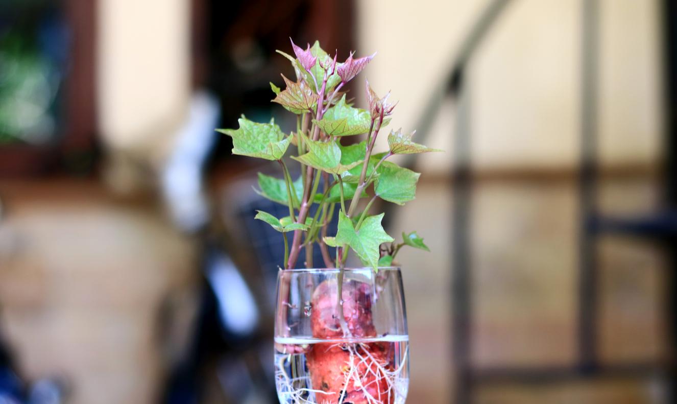 Puedes optar por cultivar plantas del boniato directamente en agua. De hecho, si lo mantienes ahí podrás ver como poco a poco van creciendo nuevos tallos del mismo que darán como resultado una planta más que llamativa para decorar cualquier rincón de tu hogar. Además, podrás volverla a trasplantar cuando quieras, tan solo asegúrate de que reciba luz solar directa a diario.