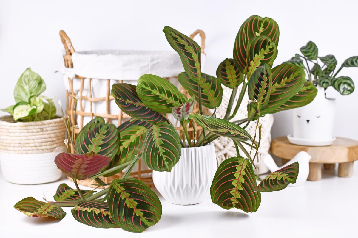Esta planta perenne es conocida también como maranta tricolor o planta de la oración. Este último nombre viene dado por la forma en que sus hojas se cierran ligeramente durante la noche. Para su crecimiento y desarrollo de necesita recibir luz constante, pero de forma indirecta, y estar situada en una zona húmeda. Un consejo para que mantener esa humedad ambiental que necesita es pulverizar agua sobre sus hojas durante los meses más calurosos.
