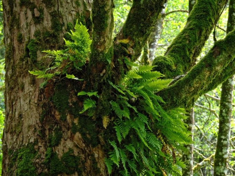 En la imagen de abajo se pueden ver musgos y helechos, que son plantas epífitas, viviendo en un árbol.
