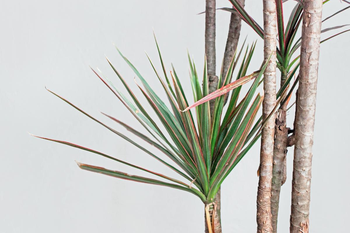 La Dracaena marginata sesarrolla hojas largas y planas color verde oscuro, con márgenes rojizos, que se elevan sobre delgados tallos estriados. Crecen lento, así que pueden mantenerse bien en interiores. Necesitan luz solamente indirecta, y es de riego moderado de una vez a la semana. Para la maceta, debe ser reducida porque así es como mejor se desarrollan.