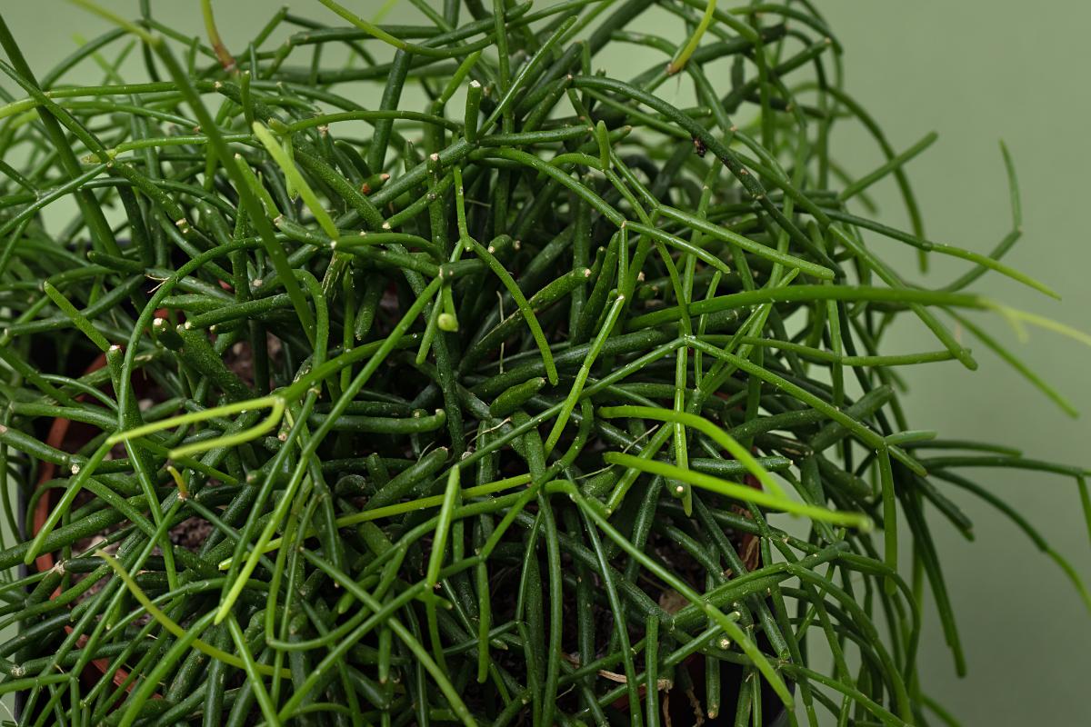 Es una especie única dentro de la familia de los cactus. A diferencia de sus parientes, es un cactus epífito que crece de forma colgante, con tallos largos y delgados que pueden alcanzar hasta un metro de longitud. Sus pequeños frutos blancos o rosados le dan un aspecto delicado. Originario de las selvas tropicales, este cactus prefiere luz indirecta y humedad moderada, adaptándose perfectamente a interiores. Es una opción ideal para colgar en macetas, aportando un toque exótico y bohemio al espacio.