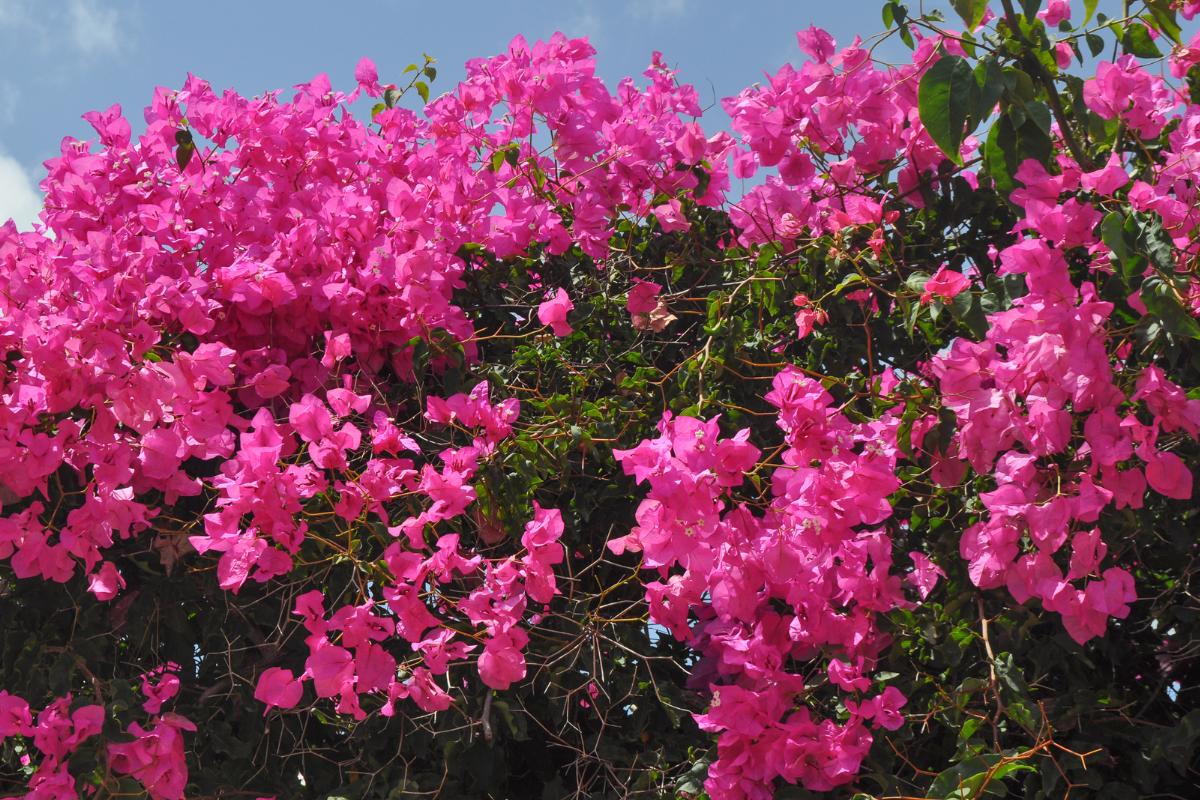 Otra de las plantas resistentes al sol para terrazas y jardines que incluimos en esta lista es la buganvilla, buganvilia o bugambilia. Se trata de una planta que puede crecer mucho y cubrir paredes o muros por completo, aunque se puede tener perfectamente en una maceta grande.