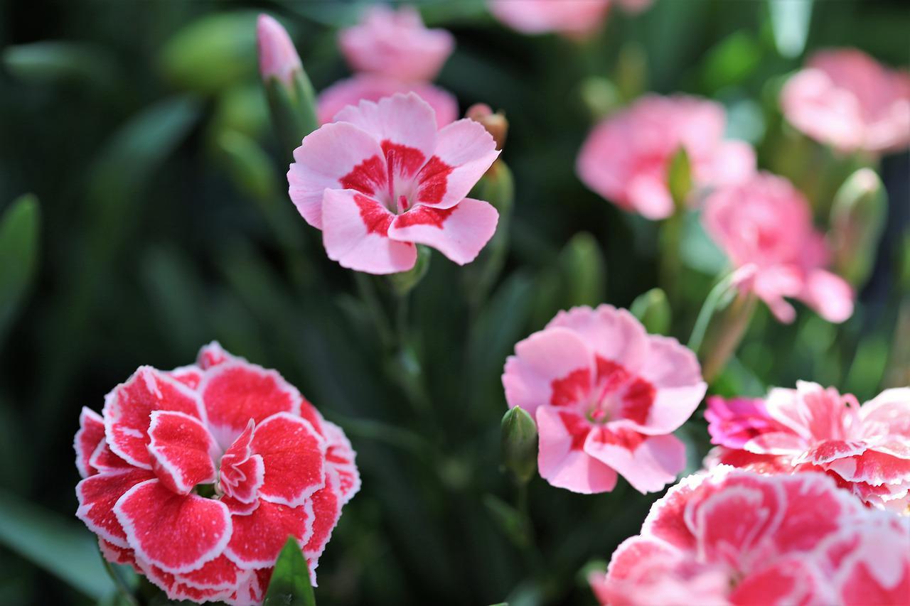 Si buscas plantas que aguanten el sol directo y sean bonitas y tengan tonos vivos, los claveles pueden ser una buena opción para ti. En la imagen vemos unos claveles rosas, de color intenso, pero los hay de muchísimos más colores como blancos, rojos, amarillos, naranjas o de combinaciones de estos tonos. Además, entre estas flores de jardín hay especies muy diversas, pues no es el mismo el clavel típico de la Península Ibérica que el clavel de Indias.