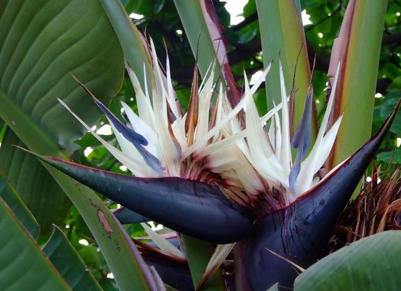 La llamada ave del paraíso, o ave del paraíso blanca, es una planta ornamental apta para su cultivo en exterior en climas cálidos. Se parece a la platanera, con grandes hojas muy bonitas y un porte a tener en cuenta, aunque sin duda lo que más destaca es su impresionante floración, con unas flores inconfundibles de colores blancos y morados que resultan imposibles de pasar por alto. Existe otra con las flores moradas y naranjas.
