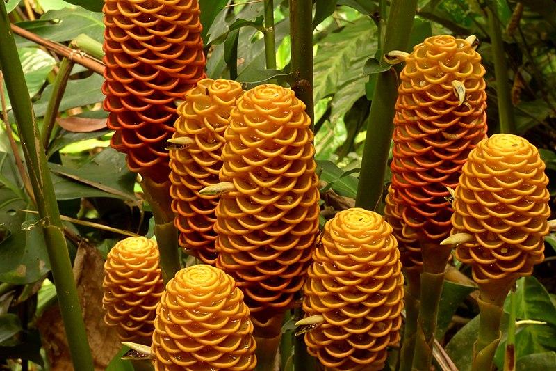 El jengibre de colmena es un primo lejano del jengibre y la cúrcuma. Es una herbácea de hasta 40 cm de altura, que presenta flores compactas y muy características, con pétalos muy cortos y que apenas se despegan entre sí, con colores que van del rojo al blanco, pasando por el naranja y el amarillo.
