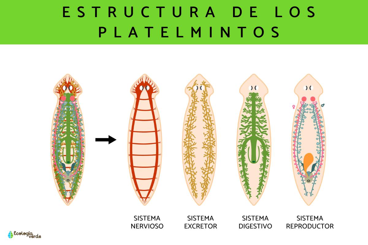 Los platelmintos pequeños carecen de tubo digestivo, solamente absorben el alimento del exterior. Su sistema digestivo es incompleto y no tienen ano. Además, tienen un sistema digestivo con una abertura hacia afuera que está dividido en varios canales para que pueda llegar a todos los tejidos, sin necesidad de sistema circulatorio que los transporte.