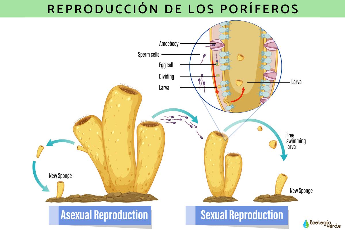 - Reproducción sexual: las esponjas son hermafroditas, produciendo simultáneamente óvulos y espermatozoides. Los espermatozoides son expulsados a través del ósculo, fertilizando los ovocitos en el mesohilo de otras esponjas. El desarrollo larval ocurre dentro de la esponja, y las larvas nadan libremente antes de ser liberadas.