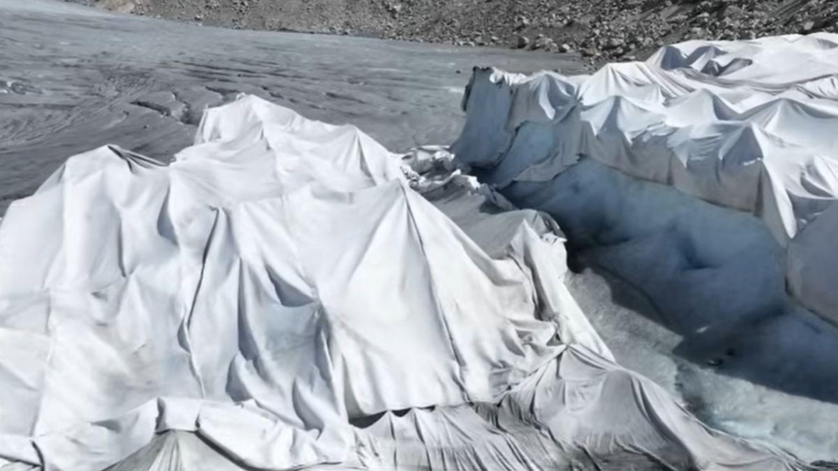La escena parece sacada de una película extraña. Un glaciar de alta montaña cubierto con enormes telas blancas, como si alguien hubiera intentado arropar el hielo para que no se derrita. No es una metáfora. Está ocurriendo de verdad.