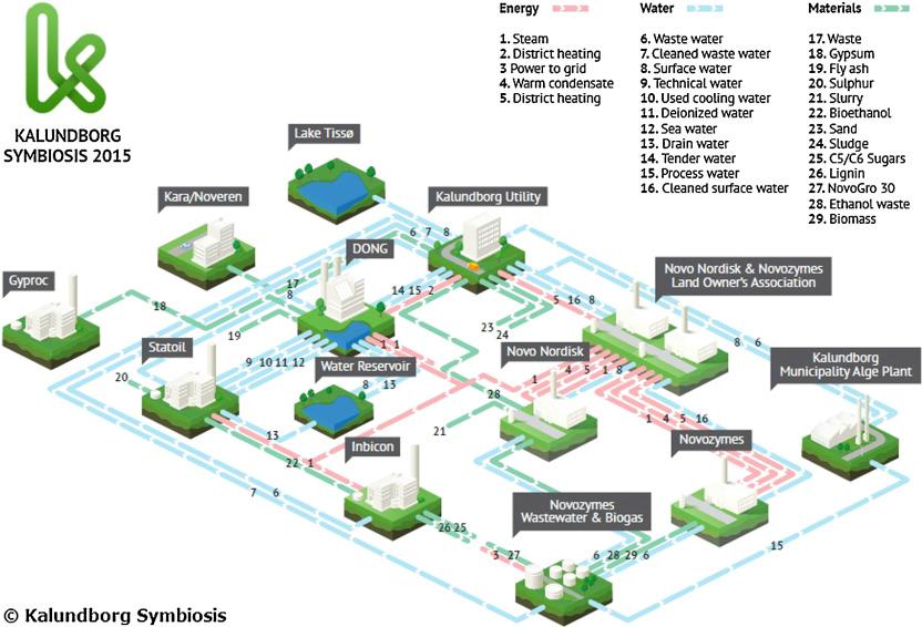 Los entornos que han implementado modelos de ecología industrial van mucho más allá de los clásicos polígonos industriales. Un buen ejemplo lo encontramos en Kalundborg, una localidad de unas 20.000 personas situada al norte de Dinamarca.