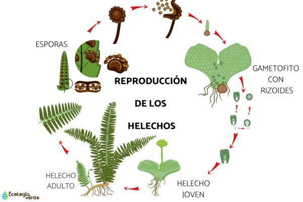 - En el caso de los helechos, pteridofitos o también llamadas plantas pteridofitas, la esporogénesis se da en el envés de las hojas, en unas estructuras que reciben el nombre de esporangios o, cuando se trata de la fusión de varios de ellos, sinangios. Producen megasporas haploides que, al ser liberadas y cuando las condiciones son favorables, dan lugar a un gametofito que, más adelante, será capaz de producir un nuevo esporofito capaz de empezar una vez más el ciclo. Te animamos a conocer más detalles sobre Cómo se reproducen los helechos con la lectura de este otro artículo.