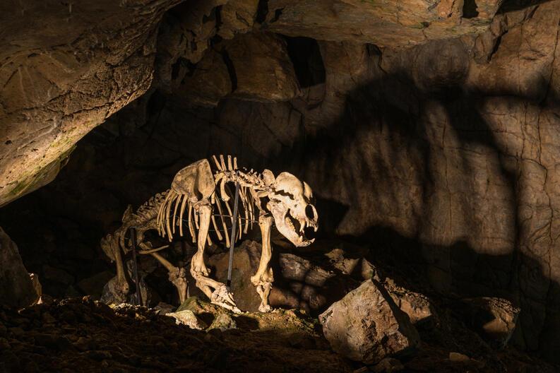 El oso de las cavernas (Ursus spelaeus) era más grande que el oso Kodiak, el oso gigante actual. Medía 1,3 metros de altura y 2,6 metros de largo, que al pararse en dos patas alcanzaba los 3 metros. Pesaba hasta 700 kilos y ocupó un largo rango de espacio, abarcando prácticamente toda Europa durante el Pleistoceno. Su nombre se debe a que habitaba cavernas, utilizadas para lograr sus períodos de hibernación que podía compartir con humanos prehistóricos.