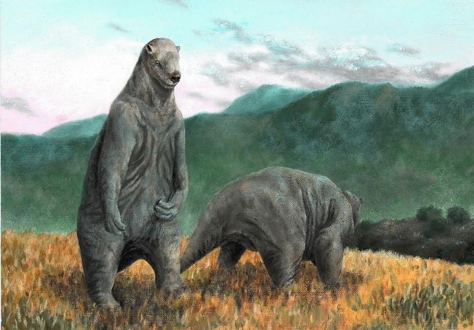 Conocidos como los perezosos gigantes comúnmente, los megaterios (Megatherium) son animales que podían llegar a medir hasta 6 metros de altura. A diferencia de los perezosos actuales que cuelgan de los árboles, eran terrestres. Se alimentaban a dos patas y se ayudaban de sus enormes uñas para sostenerse de los árboles de los que se alimentaban. También usaban estas uñas para defenderse o hasta para escarbar en busca de tubérculos comestibles. Esta especie de megafauna existió desde el Pleistoceno hasta el Holoceno.