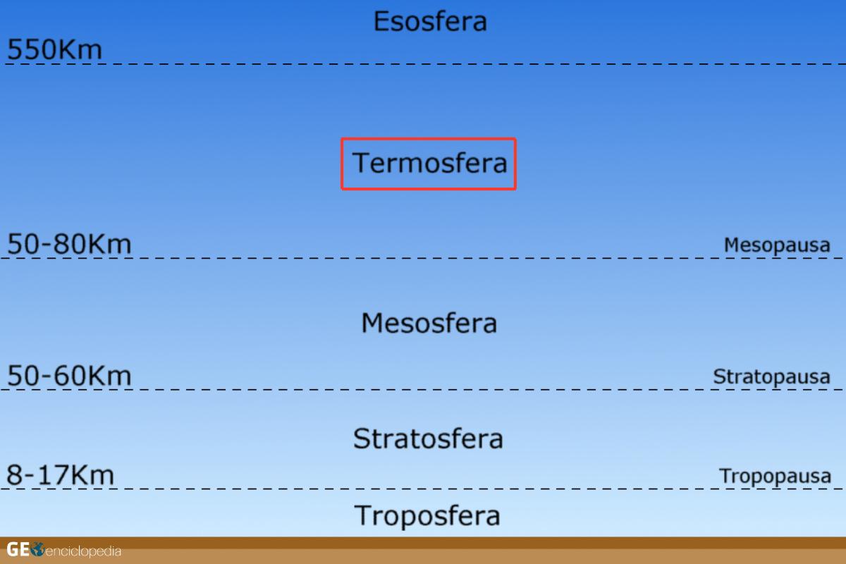La termosfera es una capa de la atmósfera terrestre que se encuentra por encima de la mesosfera y debajo de la exosfera. Su altitud varía aproximadamente entre 80 kilómetros y 600 kilómetros sobre el nivel del mar.