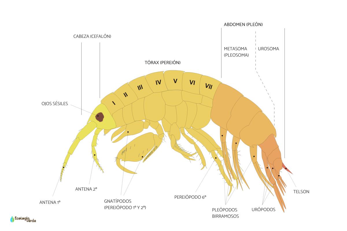 - El cuerpo de los anfípodos está segmentado en tres partes: cefalón, pereion y pleon. A su vez poseen apéndices a lo largo del cuerpo que cumplen las funciones de locomoción, alimentación, reproducción y respiración.