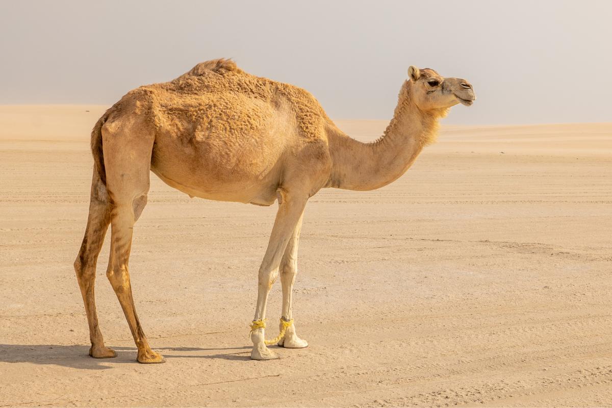El camello es un mamífero artiodáctilo de la familia Camelidae, caracterizado por su locomoción digitígrada y pezuñas adaptadas a terrenos áridos. Como ungulado de dedos pares, distribuye su peso entre el tercer y cuarto dedo. Sus jorobas almacenan grasa, permitiéndole sobrevivir en condiciones extremas. Originario de Asia, ha sido domesticado por su resistencia y capacidad de recorrer largas distancias sin agua.