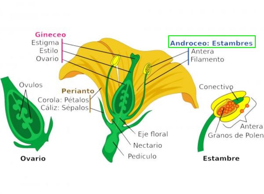 Se conoce como estambre al órgano masculino de la flor. Este se presenta como una pequeña hebra alargada, una hoja modificada, que suele sobresalir del centro; es aquí donde se encuentra el estambre de la flor. Del mismo modo, en los estambres es donde se localizan los sacos polínicos que es donde se produce el polen.